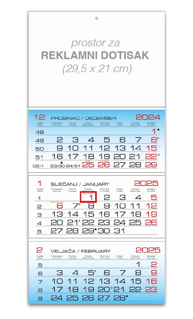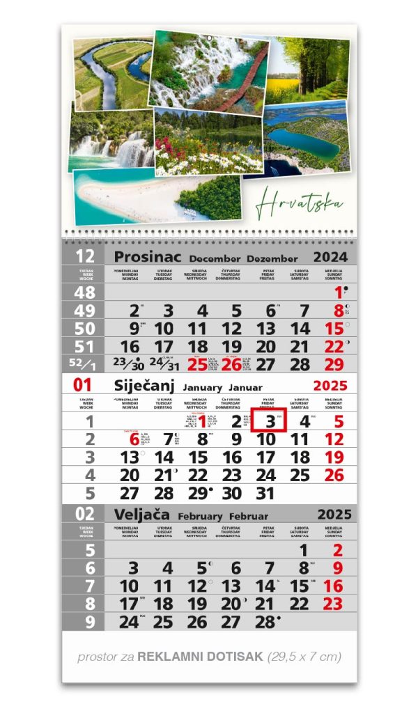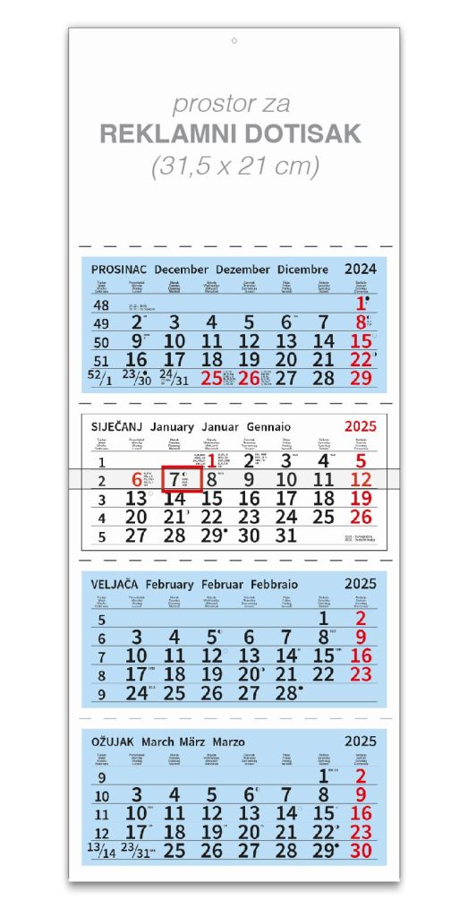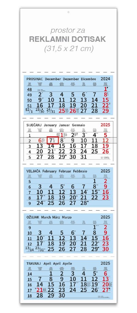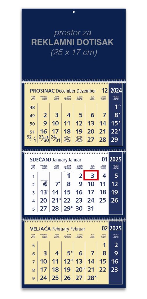 | DORADA: | spiralni uvez zaglavlja i kalendarija, rupica za ovjes, bigani kalendarij u 3 bloka |