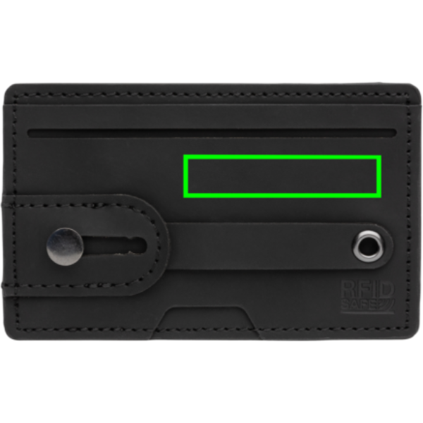 PU material RFID card wallet that can also be used as phone holder and stand. This RFID cardholder can fit up to 2 bank cards or ID cards and will keep them protected from unauthorised scans and fraudulent activities. The adhesive tape on the back allows you to stick the cardholder to a mobile with a flat surface. The item has a strap that functions both as a holder and as a stand.