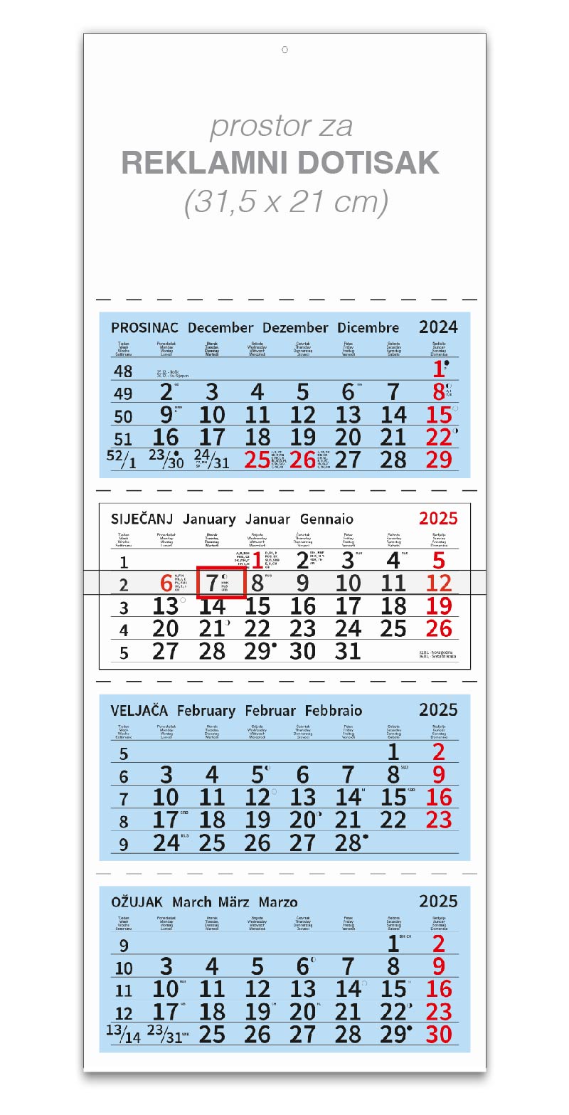 Poslovni kalendari su vrlo funkcionalni, jer na istom listu imamo uvid u prethodni, tekući i naredni mjesec. Razlikujemo poslovne kalendare po tome dali su mjeseci na jednom ili na više odvojenih listova. Postoji više načina obilježavanja datuma: klizač – po kliznoj traci pomičemo obilježavač datuma, jahač – obilježavač datuma umećemo u utor lista kalendara i elektrostatska folija – foliju pomičemo po površini kalendara. Dotisak Vašeg logotipa i/ili vaših podataka na zaglavlje poslovnih kalendara nije uračunat u cijenu, ali smo Vam u mogućnosti ponuditi isto.