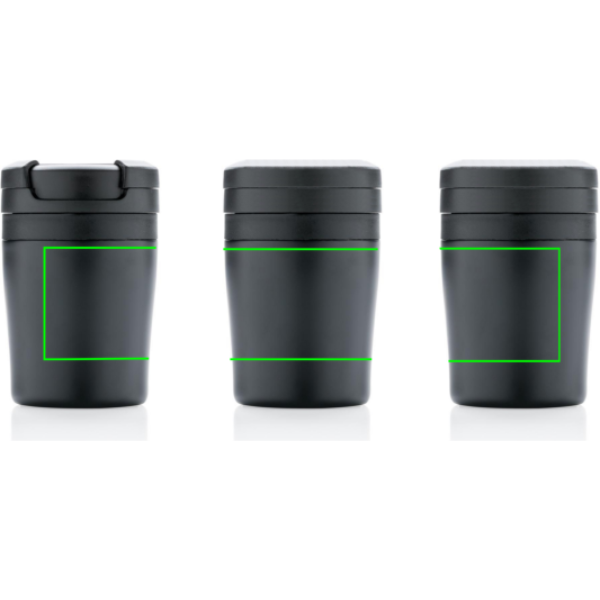 Less is more. Being 8cm high this is the perfect double wall mug for your coffee machine. PP inner. Easy twist spill proof lid. Great for Ristretto, Espresso and Lungo coffee. Hand washable only. Content 160ml. Registered design®
