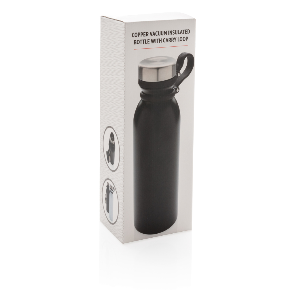 Leakproof copper vacuum insulated bottle with black silicone carry loop. One handed drinking means no need to store or carry the lid. Comes with a double-wall vacuum construction with copper insulation which means it keeps drinks hot for up to 8 hours and cold for up to 24 hours. The construction prevents condensation on the outside of the bottle. Content: 600 ml.