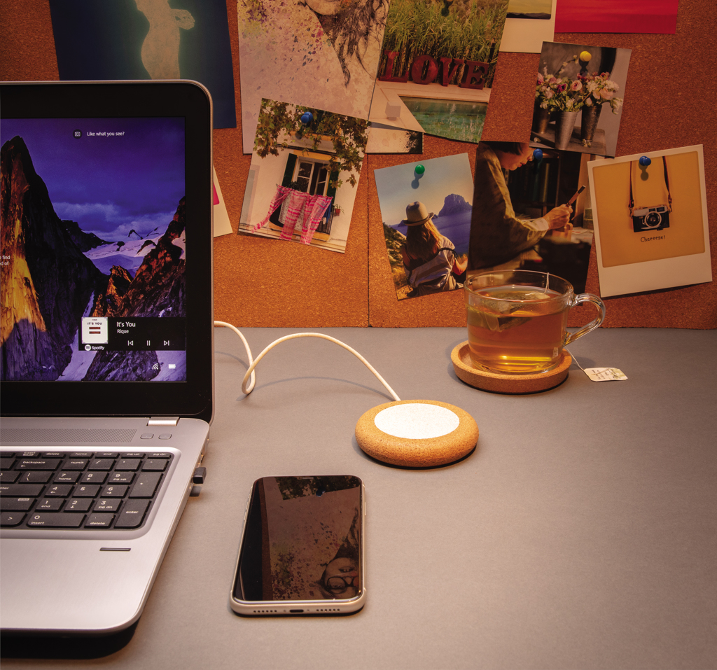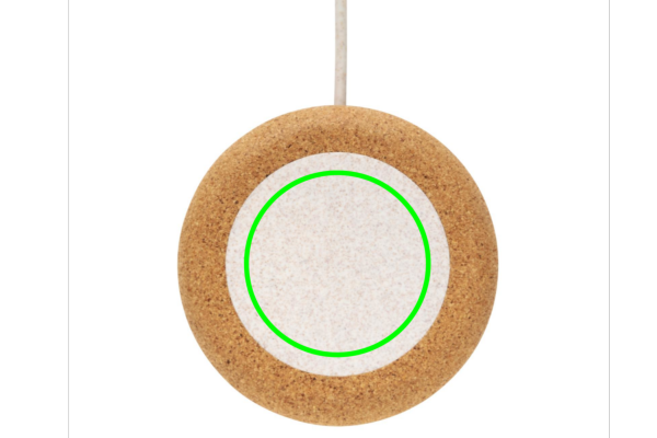 5W wireless charger with wheat straw (35%) mixed with ABS and natural cork. With integrated 120 cm wheat straw/tpe cable for direct use. Compatible with all QI enabled devices like Android latest generation, iPhone 8 and up. Input: 5V/2A; Output: 5/1A – 5W. Item and accessories 100% PVC free.