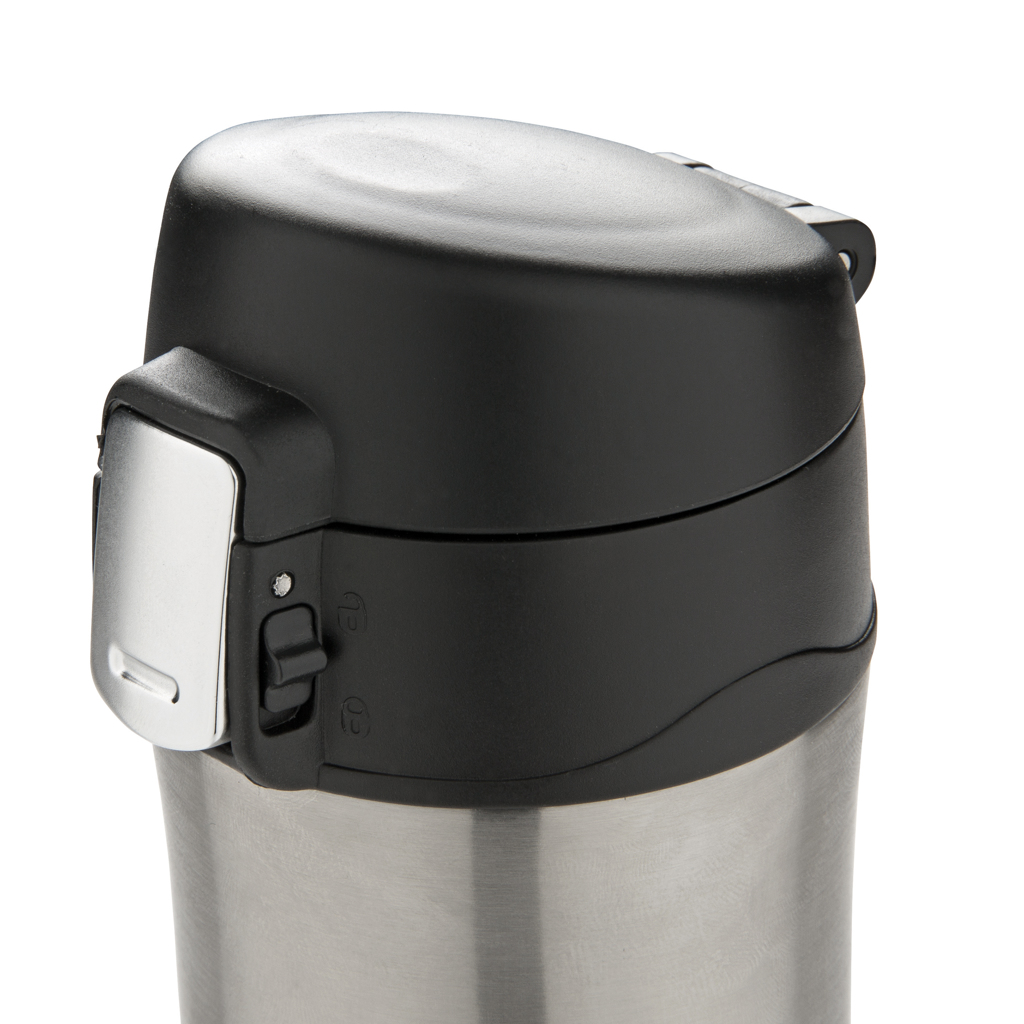 Double wall stainless steel vacuum flask that keeps your drink warm for up to 5 hours or cool up to 15 hours. The lid is lockable and therefore avoids any risk of leaking or spilling. The lid is easy to keep clean for optimal hygiene and can even be washed in the dishwasher. The unique design of the flask allows you to drink conveniently and safely with one hand directly from the flask. The size of the flask is suitable to place in any car drink holder. Capacity: 450 ml.
