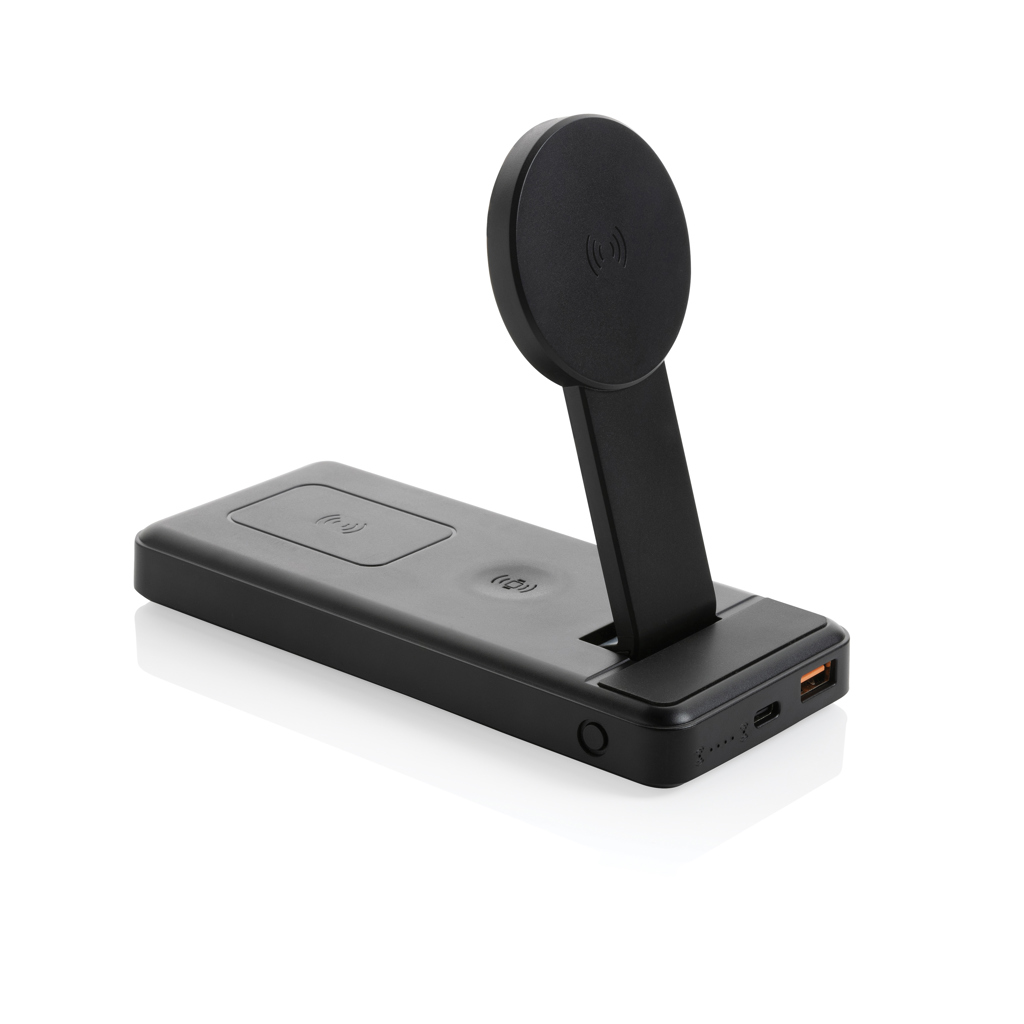 Unique 3 in 1 design 10.000 mAh 15W powerbank with a case made out of RCS certified recycled ABS plastic. RCS (Recycled Claim Standard) is a standard to verify the recycled content of a product throughout the whole supply chain. Total recycled content: 22 % based on total item weight.The powerbank contains a long lasting grade A 10.000 mAh lithium polymer battery. The powerbank has a foldable integrated 15W magnetic wireless charging stand and 5W secondary wireless charger that can be used for smaller wireless items like earbud cases and a third 2.5W watch charger for IOS watches. The power indicators will indicate the remaining energy level so you always know when to re-charge.; item and accessories PVC free. Including RCS certified recycled TPE charging cable. Packed in FSC® mix packaging. Type-C input 5V2.5A 9V2A 12V1.5A; Type-C output:5V3A 9V2.22A 12V1.67A; USB-A output:5V3A 9V2A 12V1.5A 5V4.5A