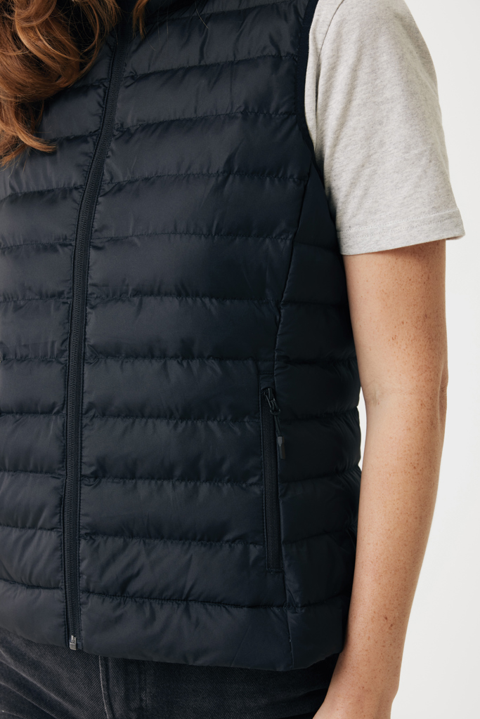 Women’s medium fit bodywarmer made from 100% post-consumer recycled polyester. The bodywarmer is fully quilted with 100% recycled polyester pearl filling. It has a reversed zipper at the front and practical zip pockets in the side panel seams. All zippers have extra zip pullers in matching colour for a refined look. The armholes have elastic binding and all seams at the inside are clean finished with recycled binding. Fluorine/PFAS free water repellent impregnation. The use of genuine recycled fabric materials and environmental impact claims are guaranteed, by using the AWARE™ disruptive physical tracer and blockchain technology. By scanning the QR code, you will gain access to a dedicated digital passport. 2% of proceeds of each sold product will be donated to Water.org. This product is OEKO-TEX® STANDARD 100 certified. The Meru bodywarmer is also available in men fit.