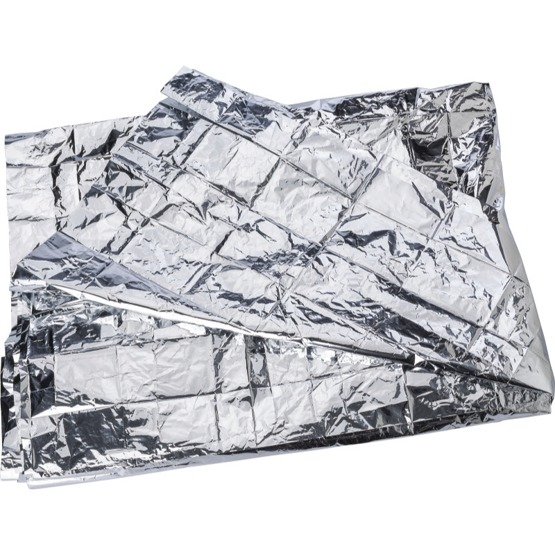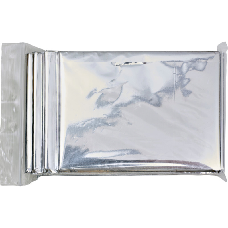 Aluminium foil thermal blanket. Packaged in a polybag.