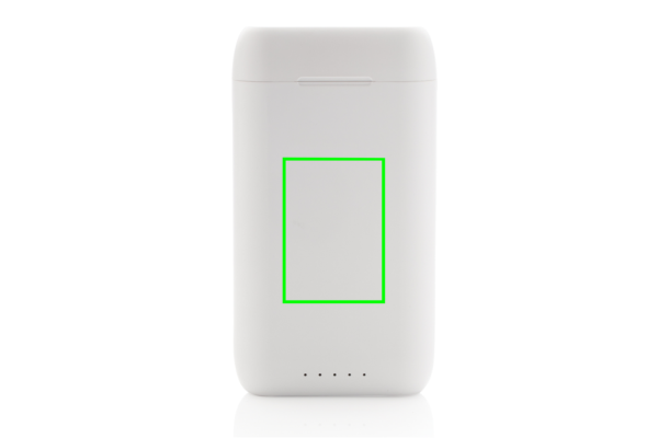 Unique 2 -in- 1 design powerbank with integrated true wireless earbuds. ABS material earbuds and casing including charging indicator light. The earbuds use BT5.0 for smooth and easy connection of the earbuds with your phone. The earbuds have a 35 mah battery that allows a play time up to 2 hours. Re-charging is done in 4 hours. Operating distance up to 10 metres. The powerbank contains a long-lasting grade A 5000 mAh lithium polymer battery that allows you to charge your mobile device up to 2 times. Type C input 5V/2A. USB output 5V/2A. Including PVC free TPE material type C cable for charging.