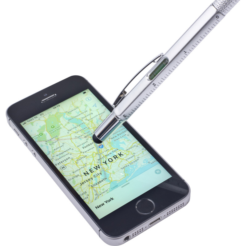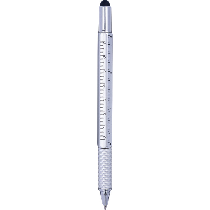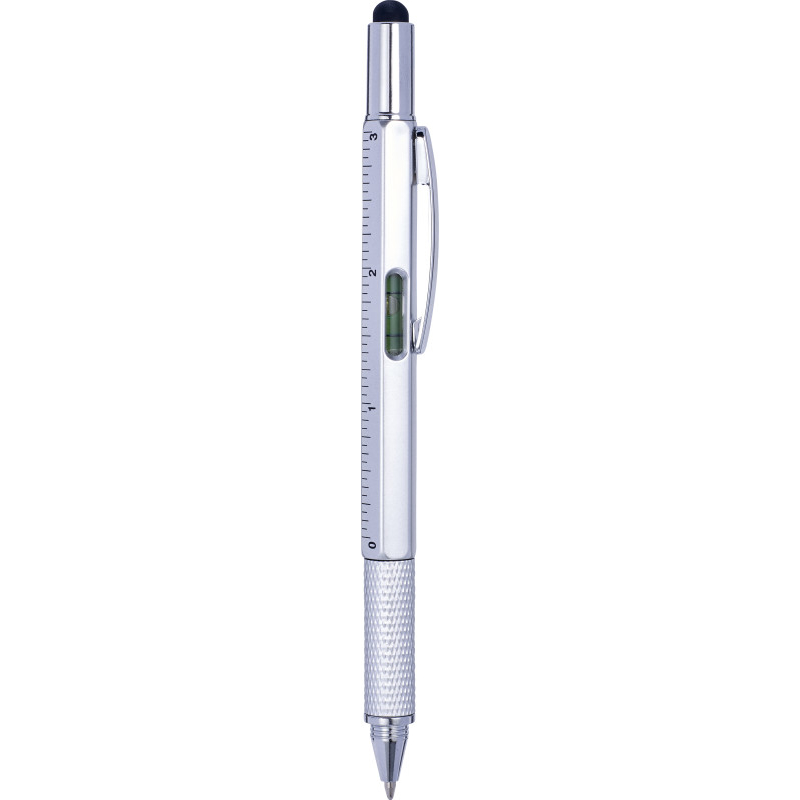 Mutltifunctional plastic ballpoint pen with twist action. Equipped with a level and ruler on the side and rubber tip for capacitive screens. Black ink.