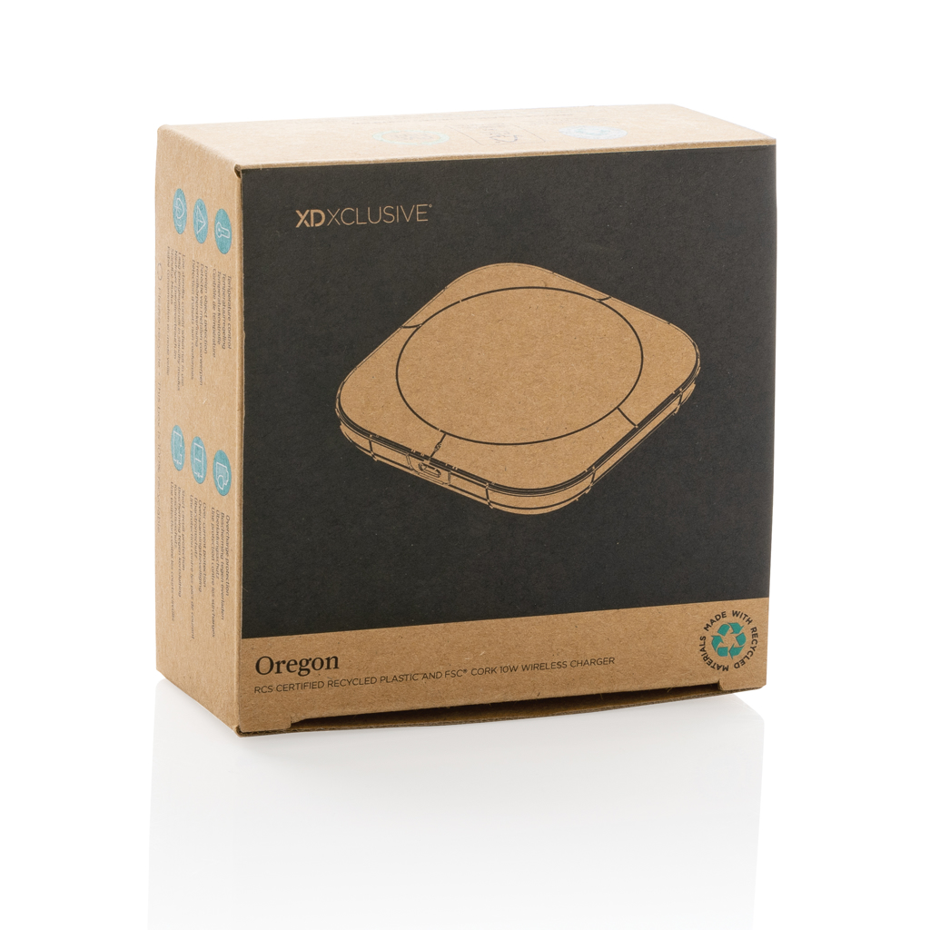 Elegant design 10W wireless charger made with FSC® 100% cork and RCS (Recycled Claim Standard) certified recycled ABS. Total recycled content: 33% based on total item weight. RCS certification ensures a completely certified supply chain of the recycled materials. Cork made from FSC 100% Cork. Wireless charging compatible with Android latest generations, iPhone 8 and up. Item and accessories PVC free. Including 120 cm type C charging cable made from RCS certified recycled TPE. Packed in FSC mix kraft box. Type-C Input 5V/2A; 9V/2A; Wireless output 5V/1A;9V/1.1A; (10W) Packed in FSC® mix kraft packaging. Item and accessories 100% PVC free.