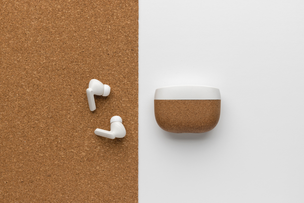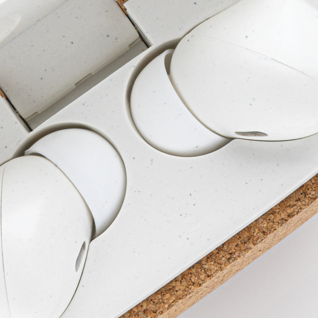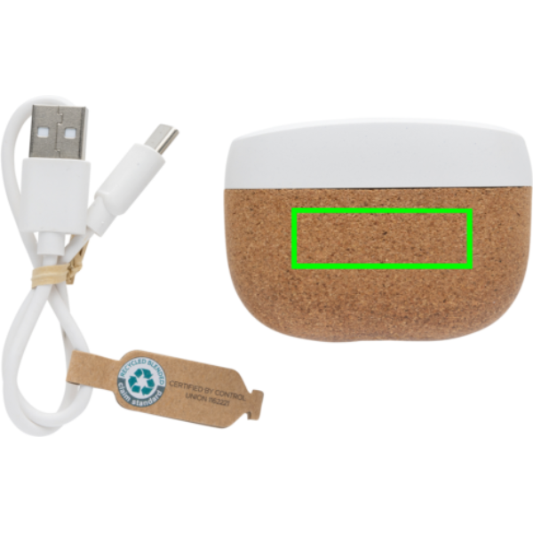 Elegant design wireless earbuds made with FSC® 100% cork and RCS (Recycled Claim Standard) certified recycled ABS. Total recycled content: 35% based on total item weight. RCS certification ensures a completely certified supply chain of the recycled materials.The perfectly fitting earbuds have a 35 mAh battery and can be re-charged in the 300 mAh charging case within 1.5 hours. With auto pairing function so easy to pair to your mobile device. Playing time on medium volume about 3 hours. With BT 5.3 for optimal connection. Operating distance up to 10 meters. With pick up and mic. Including 3 size silicone ear tips. Including RCS certified recycled TPE charging cable. Packed in FSC® mix kraft packaging. Item and accessories 100% PVC free.