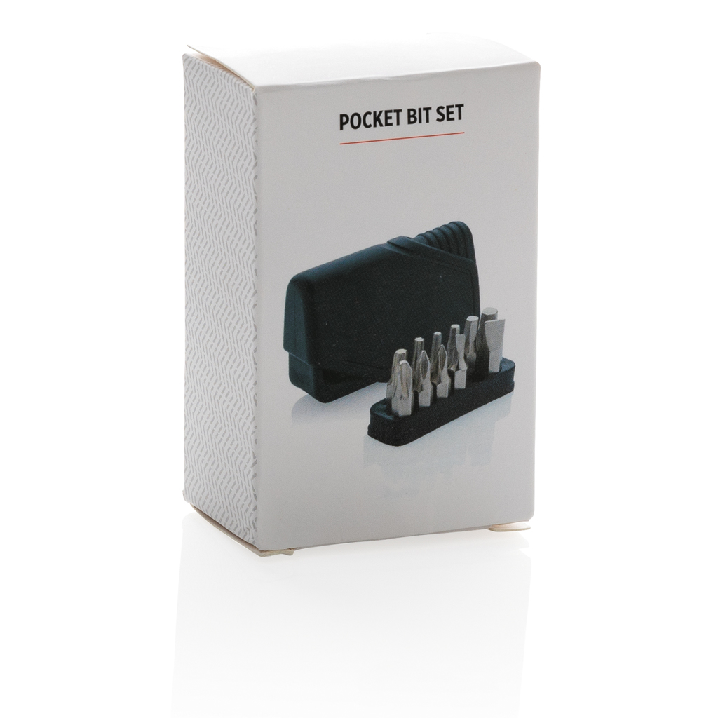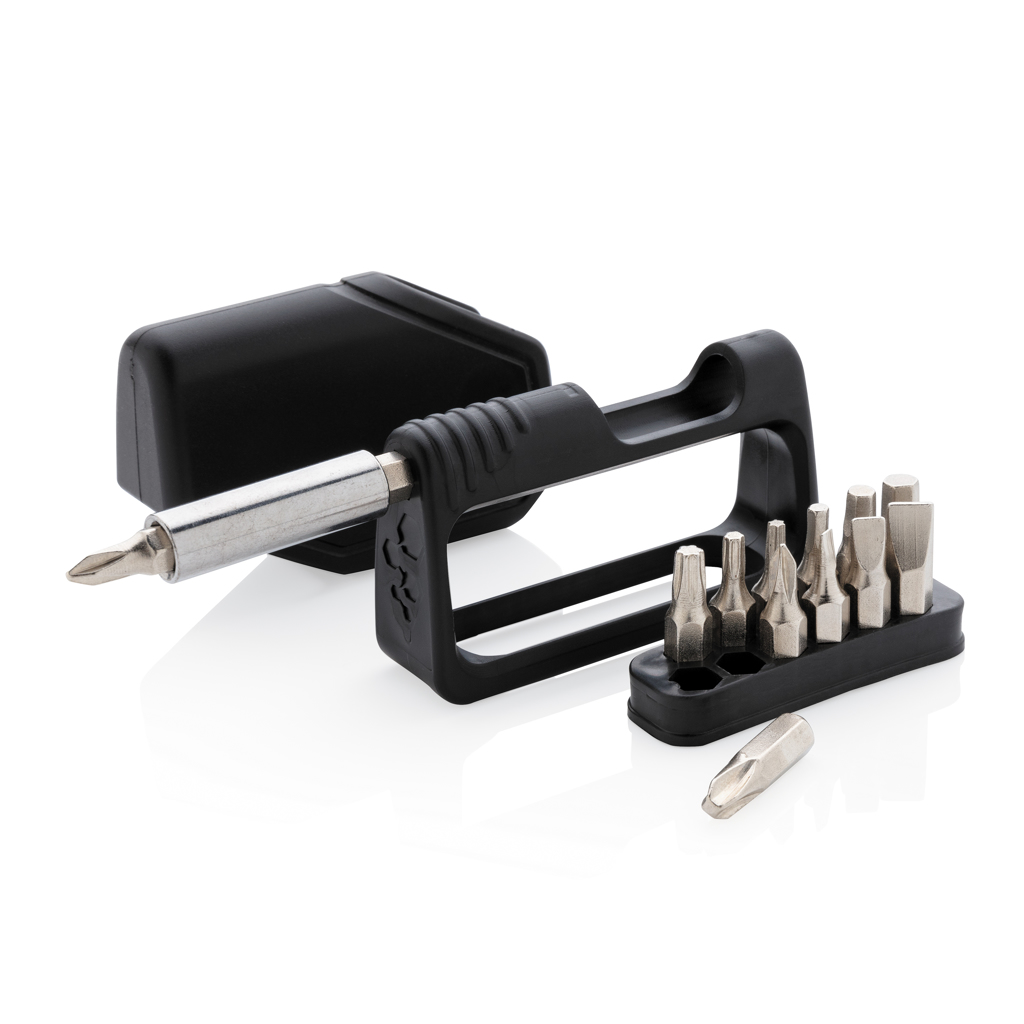 Easy to carry bit set with 12 bits and one 2” extender made from stainless steel. ABS casing with integrated holder for the bits. Bits included: 3 x TORX driver (10,15,25) 3 x Hex driver (3mm, 4mm, 5mm) , 3 x Philips drivers ( 1.8mm, #0 #2) 3 x flat drivers ( 1.8 mm, #3 #5) With belt clip to attach to belt or pocket