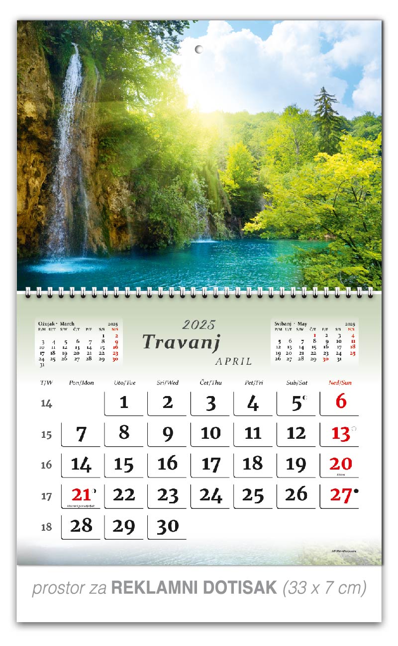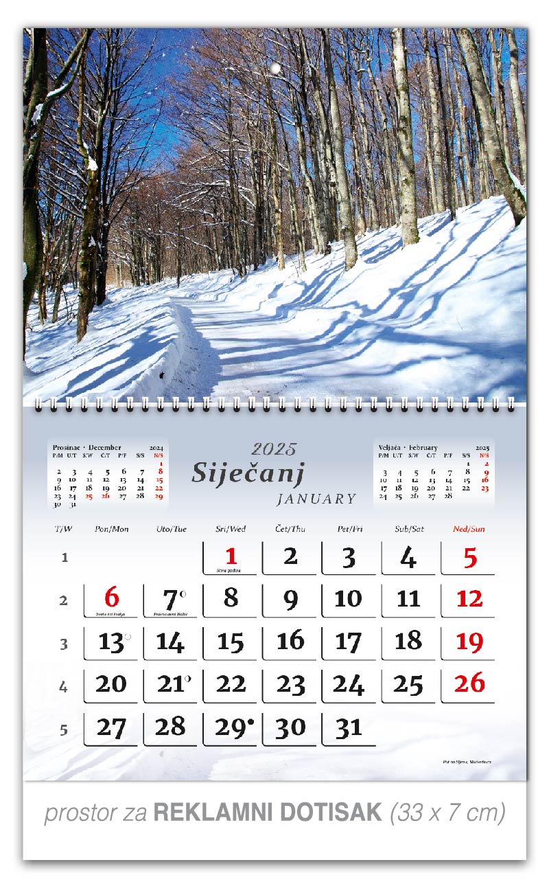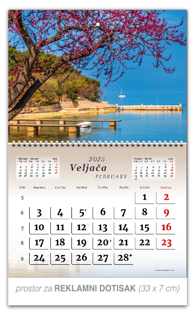 Preklopne zidne kalendare nudimo u 5 motiva. Osim tekućeg mjeseca na jednom listu kalendara, nalaze se prethodni i sljedeći mjesec, a obilježava ga preklopni spiralni uvez po sredini kalendara. Ta vrsta kalendara je praktičnija za slanje poštom.