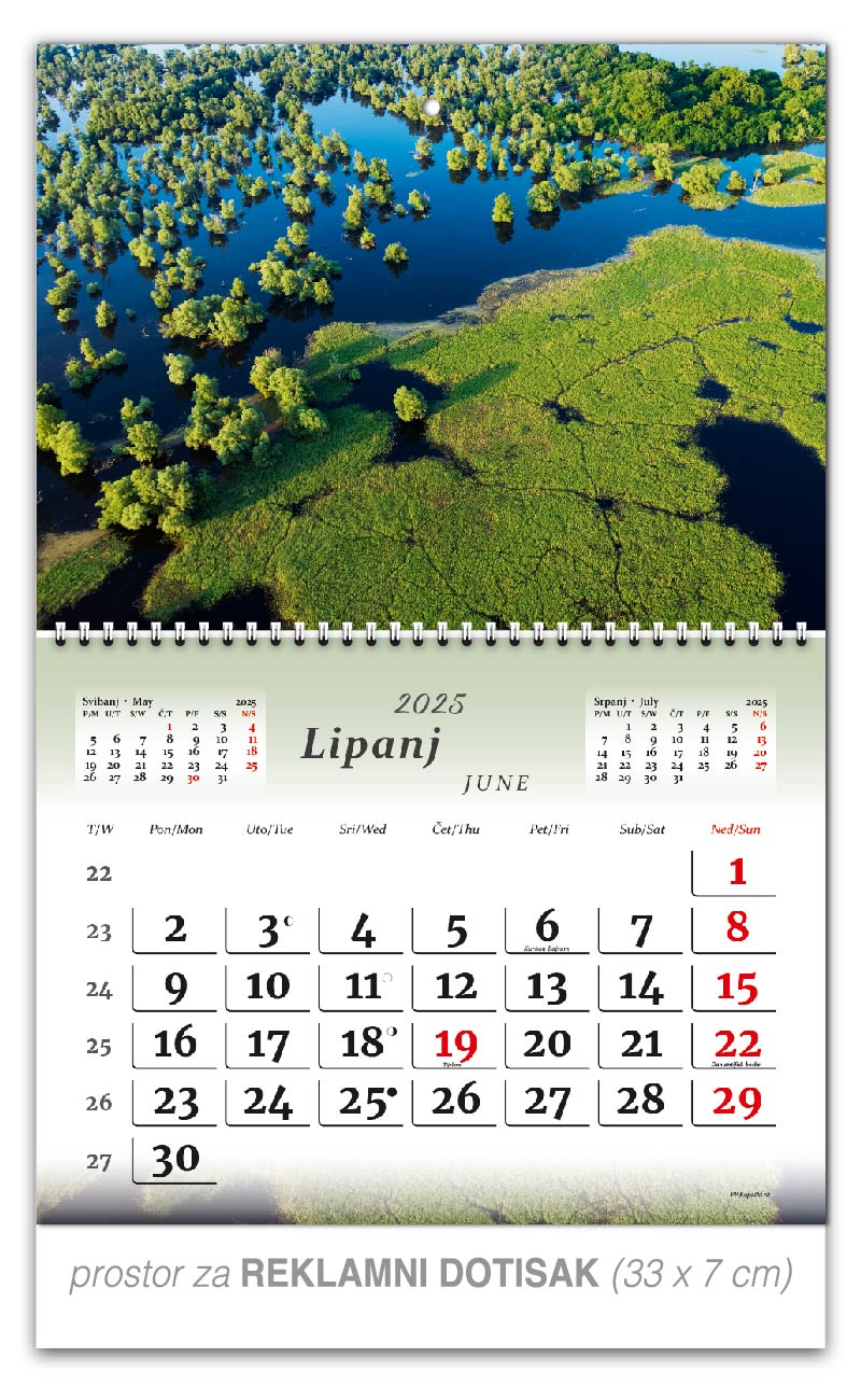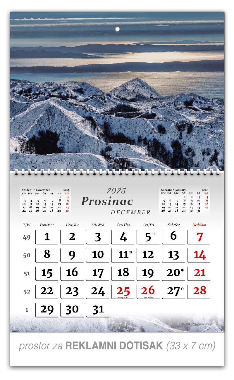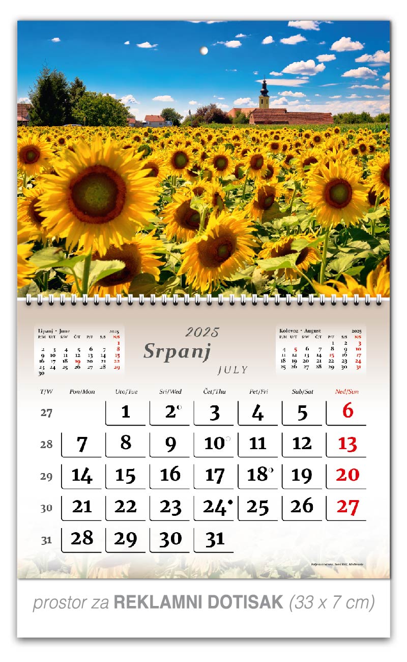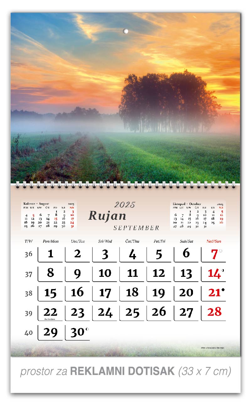 Preklopne zidne kalendare nudimo u 5 motiva. Osim tekućeg mjeseca na jednom listu kalendara, nalaze se prethodni i sljedeći mjesec, a obilježava ga preklopni spiralni uvez po sredini kalendara. Ta vrsta kalendara je praktičnija za slanje poštom.
