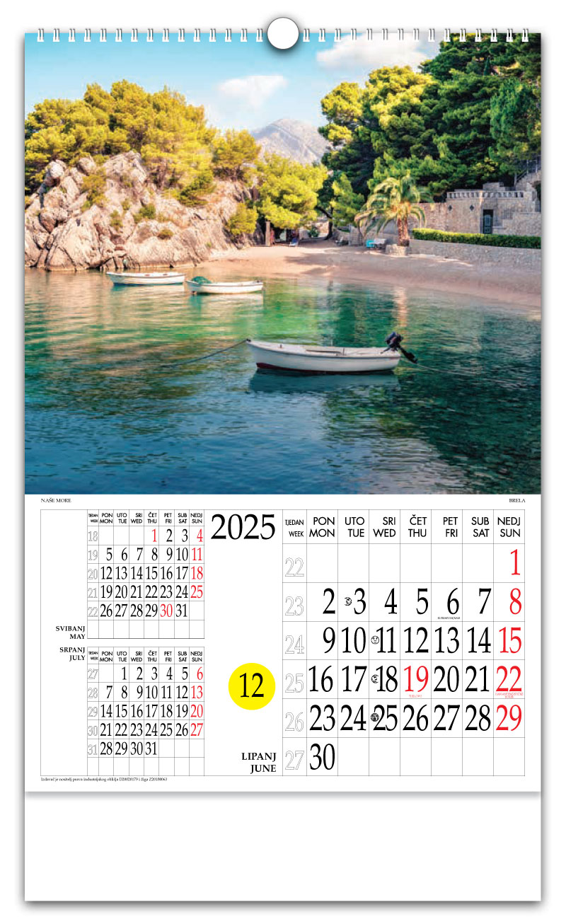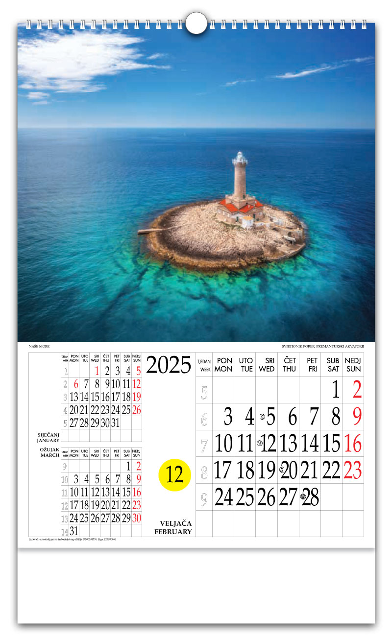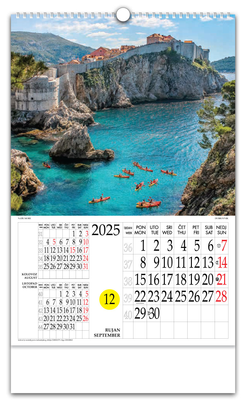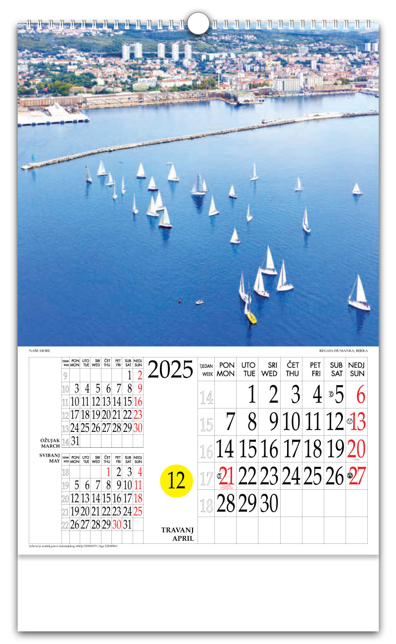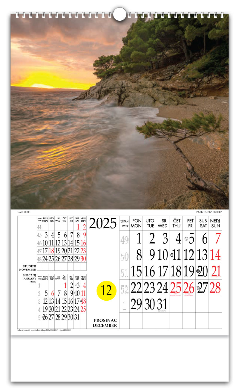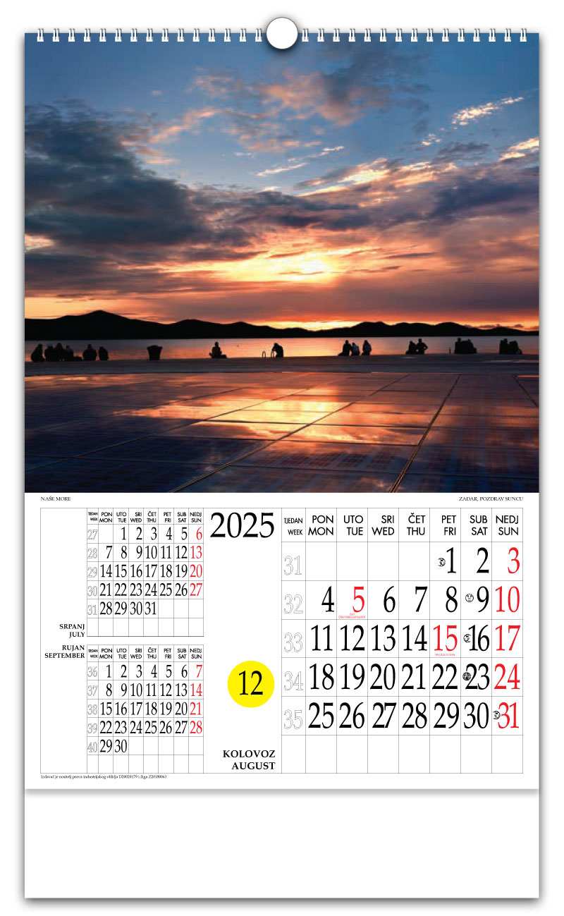 Zidni kalendar s rotacijskim krugomZidni kalendar koji, uz prikaz mjesečnog kalendara, ima istaknuti tekući dan u mjesecu kroz posebno određen otvor na kalendaru i koji se može mijenjati pomicanjem rotacionog brojčanika na poleđini kalendara. Time je aktualni datum u mjesecu posebno istaknut i vidljiv, a promjena datuma je lagana i brza. Zbog svega navedenog, te i poradi pomno odabranih i atraktivnih fotografija sa 4 različitih tema, rotacijski zidni kalendar s rotacijskim krugom jedinstven je i prepoznatljiv na tržištu od 1997. Pokazivač datumaPokazivač datuma je odštancana kružnica na svim listovima kalendara. Laganim pomicanjem datumara, na pokazivaču dobivamo prikaz datuma današnjeg dana. DatumarDatumar je nazubljen krug smješten ispod listova kalendara te prikladnim rješenjem pričvršćen za podlogu. Na svom obodu ima datume cijeloga mjeseca, on svojim kružnim isječkom vrlo malo proviruje na lijevom bočnom bridu kalendara. |