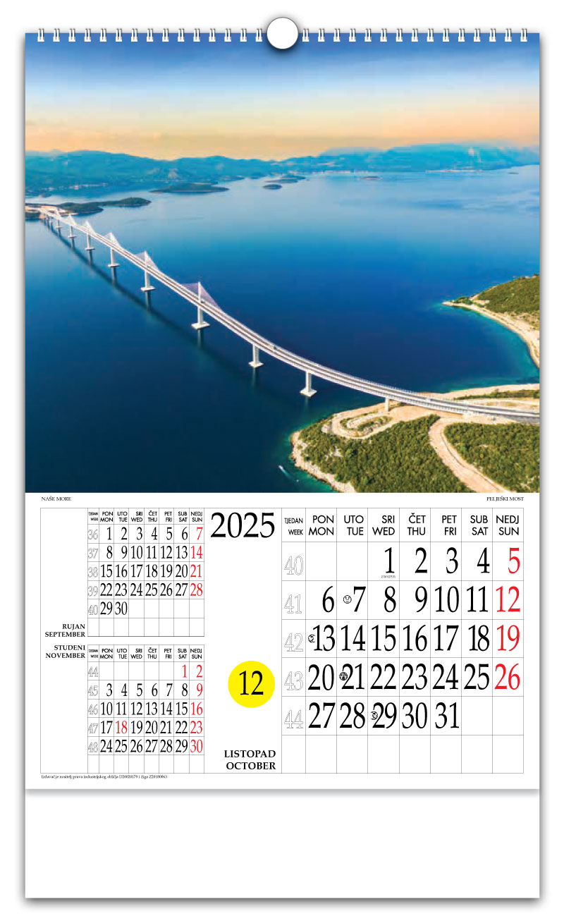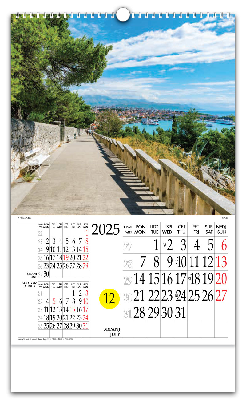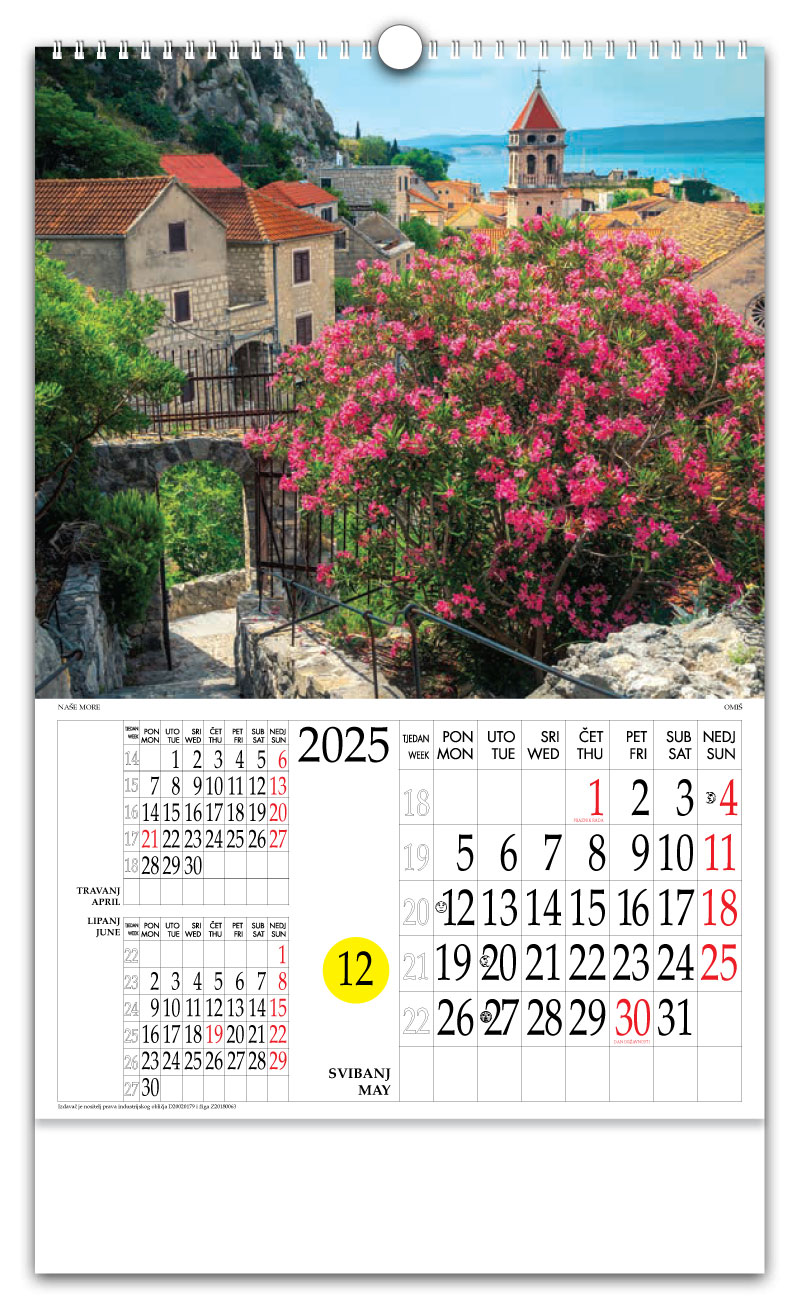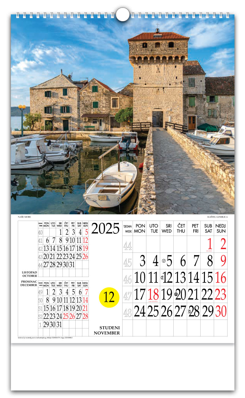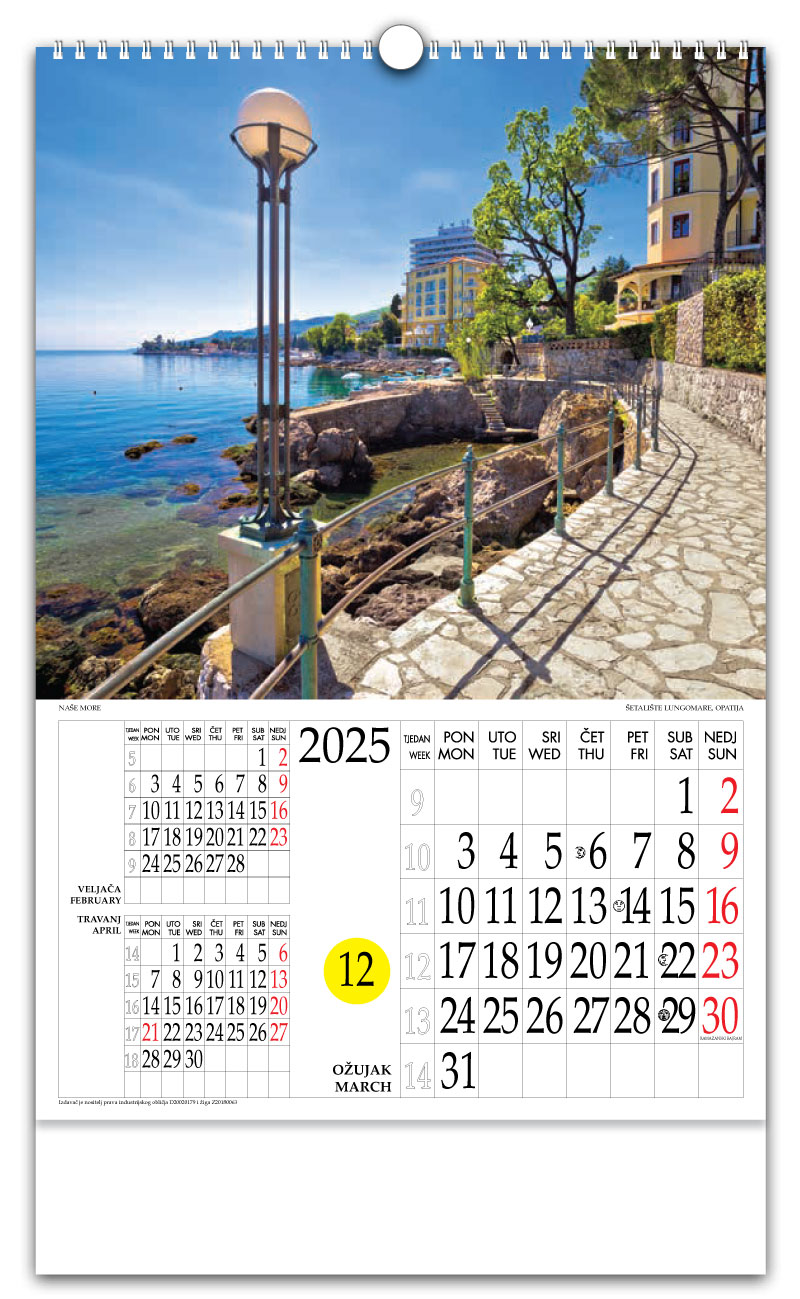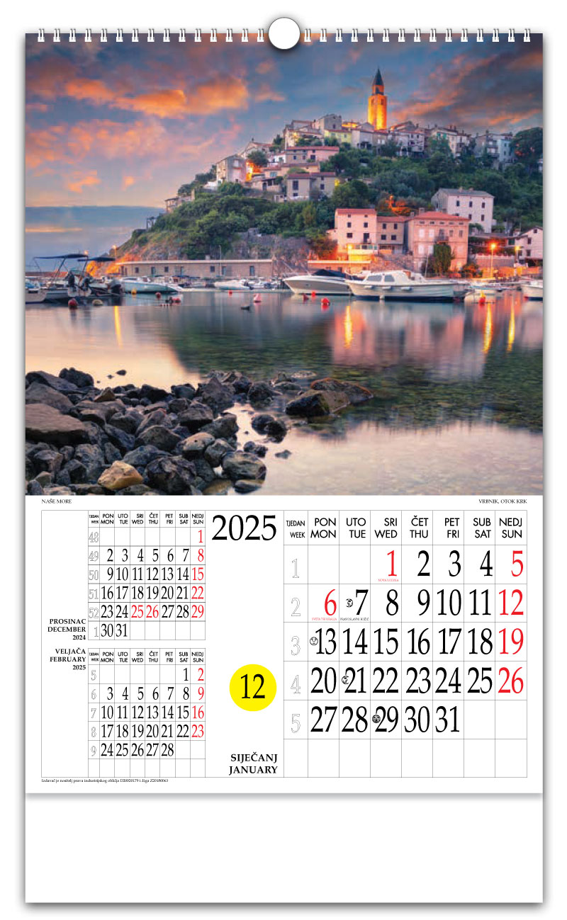 Zidni kalendar s rotacijskim krugomZidni kalendar koji, uz prikaz mjesečnog kalendara, ima istaknuti tekući dan u mjesecu kroz posebno određen otvor na kalendaru i koji se može mijenjati pomicanjem rotacionog brojčanika na poleđini kalendara. Time je aktualni datum u mjesecu posebno istaknut i vidljiv, a promjena datuma je lagana i brza. Zbog svega navedenog, te i poradi pomno odabranih i atraktivnih fotografija sa 4 različitih tema, rotacijski zidni kalendar s rotacijskim krugom jedinstven je i prepoznatljiv na tržištu od 1997. Pokazivač datumaPokazivač datuma je odštancana kružnica na svim listovima kalendara. Laganim pomicanjem datumara, na pokazivaču dobivamo prikaz datuma današnjeg dana. DatumarDatumar je nazubljen krug smješten ispod listova kalendara te prikladnim rješenjem pričvršćen za podlogu. Na svom obodu ima datume cijeloga mjeseca, on svojim kružnim isječkom vrlo malo proviruje na lijevom bočnom bridu kalendara. |