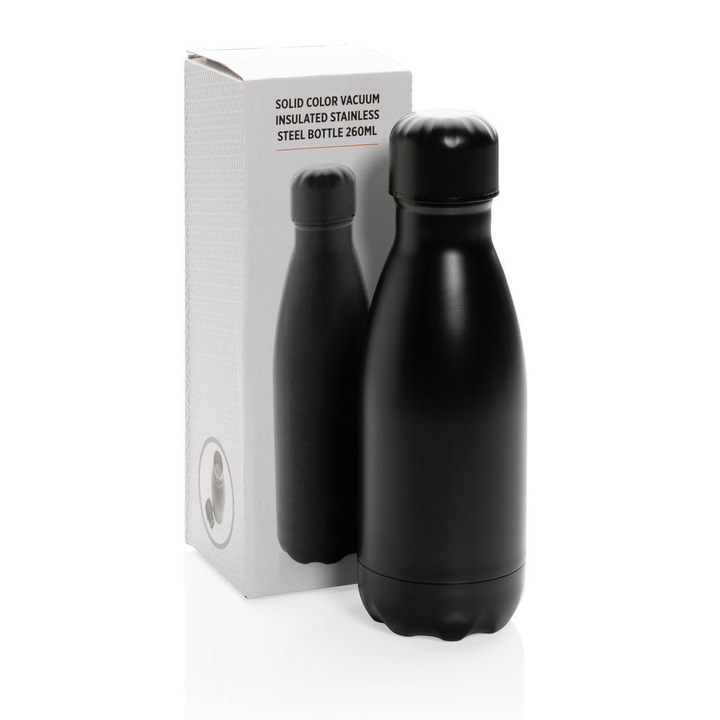 Elevate your daily water intake with this solid colour vacuum insulated stainless steel bottle. The bottle keeps chilled beverages cold for up to 15 hours and hot drinks warm for up to 5 hours. With a base that fits in most cup holders, this sleek looking water bottle will keep you hydrated on the go wherever you are. With its capacity of 260ml, it’s ideal for kids or to pop into your bag.