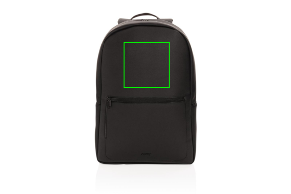 Take your commuting style up a notch with this structured backpack made with soft PU in a clean and sleek style with tonal zippers. The backpack features a top zip closure, top carrying handle, adjustable shoulder straps, external zip pocket, interior zip pocket, luggage strap and a 15.6 inch laptop pocket. Exterior 100% PU, interior 100% 210D polyester. PVC free.