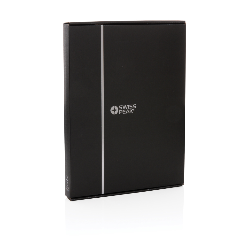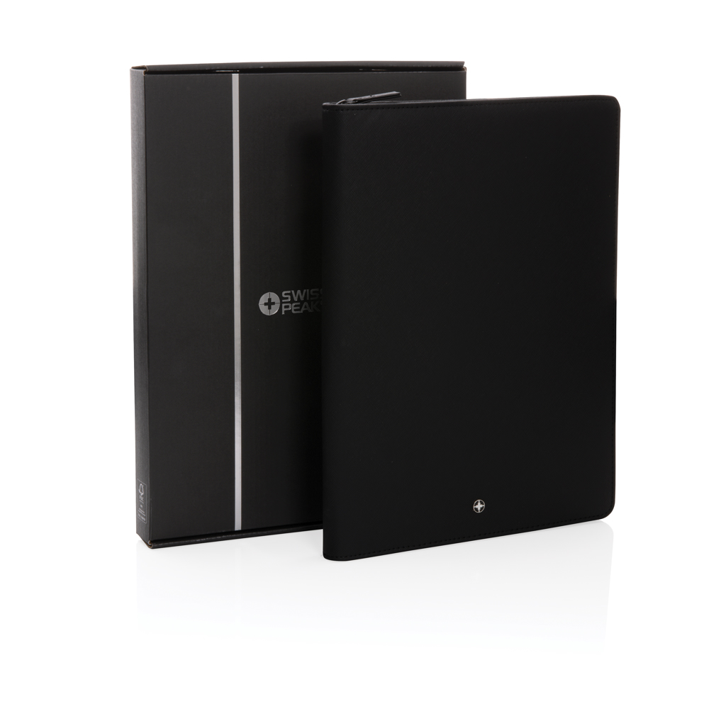 The Swiss Peak Heritage collection speaks the language of modern elegance. Presented in iconic Italian recycled PU cover with zipper . The inside provides a tablet/phone stand, gadget holders, business cards slots, sleeves for your notes and papers plus a pen loop. With lined 20 sheets A4 stone paper notepad. the portfolio is made with RCS (Recycled Claim Standard) certified recycled materials. RCS certification ensures a completely certified supply chain of the recycled materials. Made with 100% recycled RCS certified recycled PU. Total recycled content: 9% based on total item weight. PVC free.