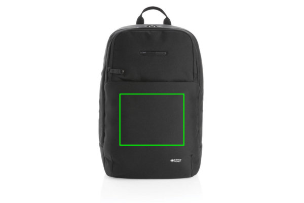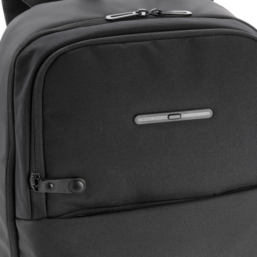 This unique Swiss Peak laptop backpack with UV-C sterilising pocket features a minimalistic design and has an integrated UV-C sterilising external front pocket, killing up to 99,9% of the bacteria on items placed inside the pouch. Perfect for sanitising your keys and phone for example while on the go in 3 minutes. The three UV-C LED lights inside are non-toxic and mercury free. The design will also ensure that the UV-C LED light will switch off automatically when the sterilising pocket is opened via the zipper so the user will not be exposed to the UV-C light. The backpack has a laptop compartment in the main pocket which fits a 15.6 inch laptop, 2 open pockets and 2 pen loops. Mesh padded back and straps for comfort. Including a micro USB cable which you can use to connect your powerbank with to charge the UV-C pouch. Exterior 600D and 900D PU coated polyester. Interiour 210D polyester. Compliant with EN62471. PVC free.