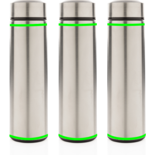 Keep coffee or tea nice and toasty in this vacuum stainless bottle with brushed metal lid. The bottle features a leak-proof screw lid and allows for drinking from any side. The wide mouth opening allows for easy cleaning. Capacity 450ml. BPA free.