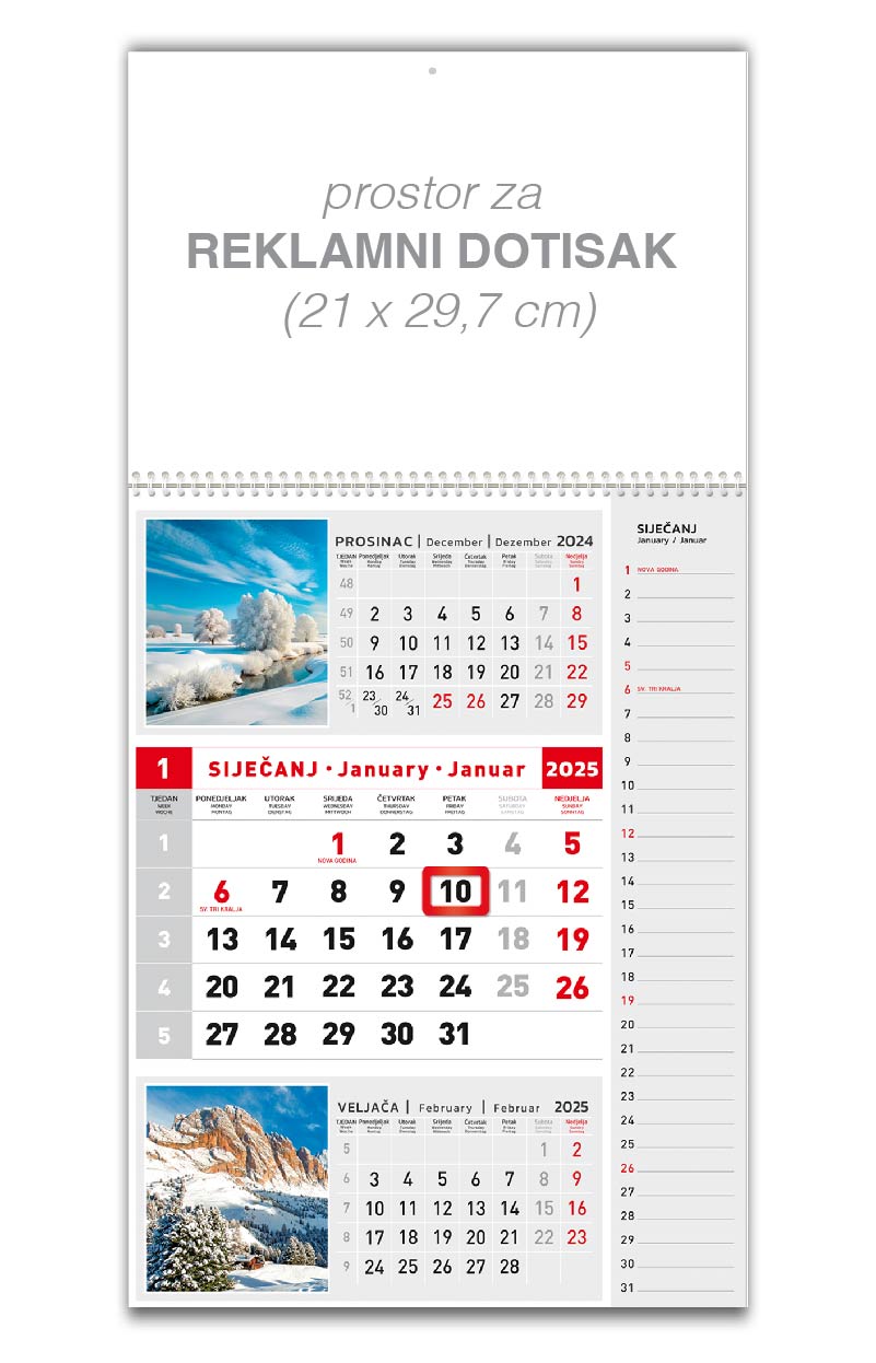 Poslovni kalendari su vrlo funkcionalni, jer na istom listu imamo uvid u prethodni, tekući i naredni mjesec. Razlikujemo poslovne kalendare po tome dali su mjeseci na jednom ili na više odvojenih listova. Postoji više načina obilježavanja datuma: klizač – po kliznoj traci pomičemo obilježavač datuma, jahač – obilježavač datuma umećemo u utor lista kalendara i elektrostatska folija – foliju pomičemo po površini kalendara. Dotisak Vašeg logotipa i/ili vaših podataka na zaglavlje poslovnih kalendara nije uračunat u cijenu, ali smo Vam u mogućnosti ponuditi isto.
