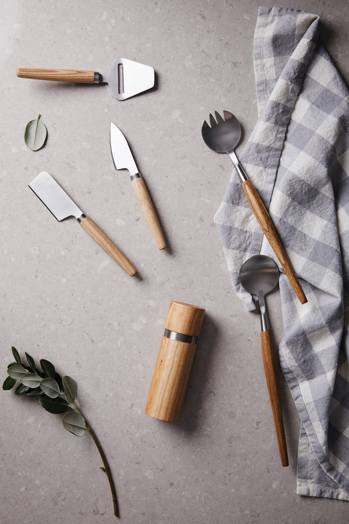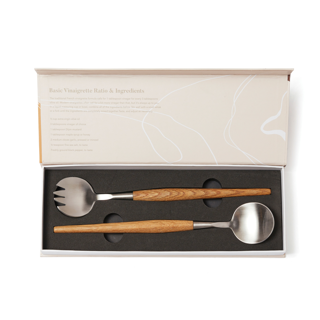 Steel serving cutlery with oak handles. A classic and minimalist design in pure Scandinavian style. The utensils are perfect for dinners and special meals at home. Packed in an exclusive gift box.