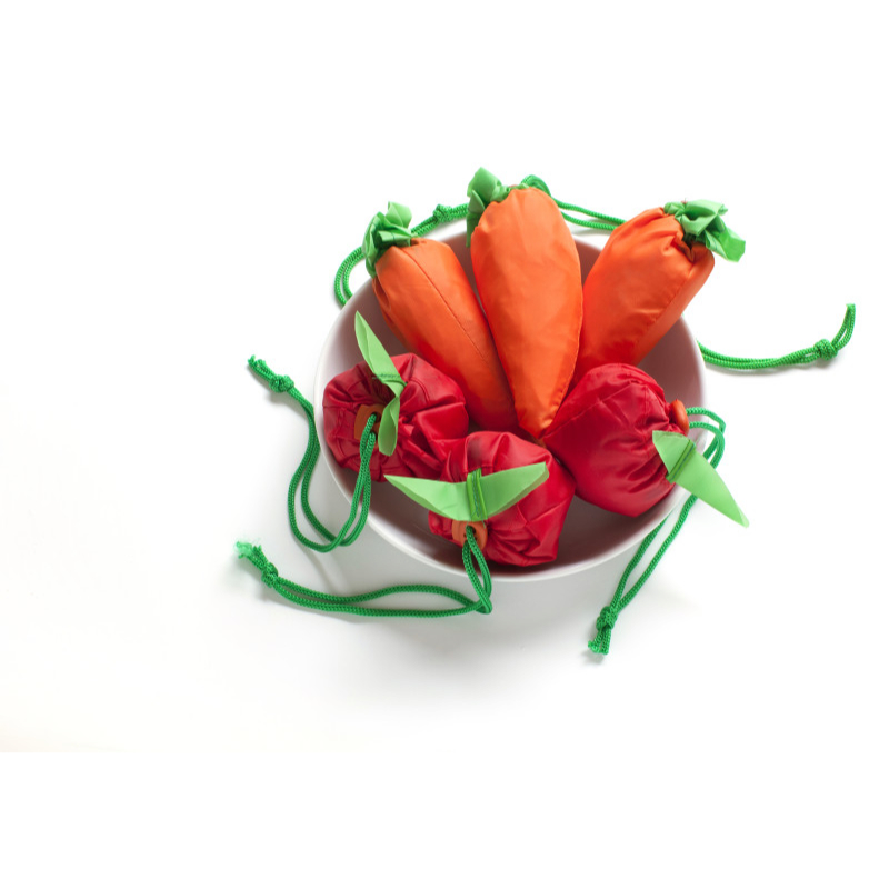 Vrećica za trgovinu opremljena sa manjom vrećicom u obliku mrkve, banane ili jabuke  za sklapanje.